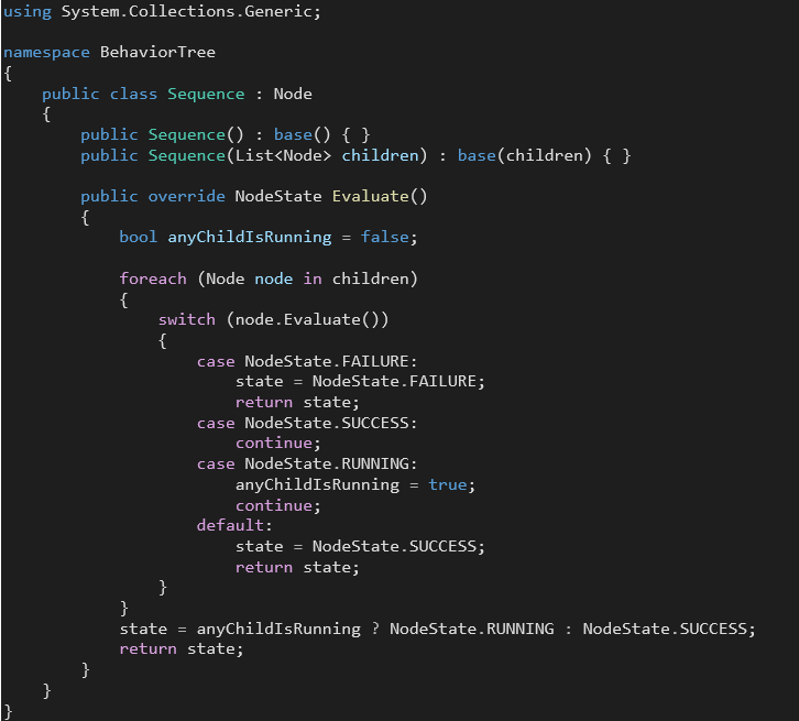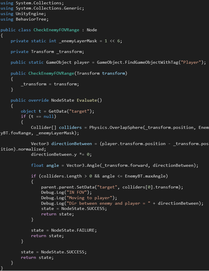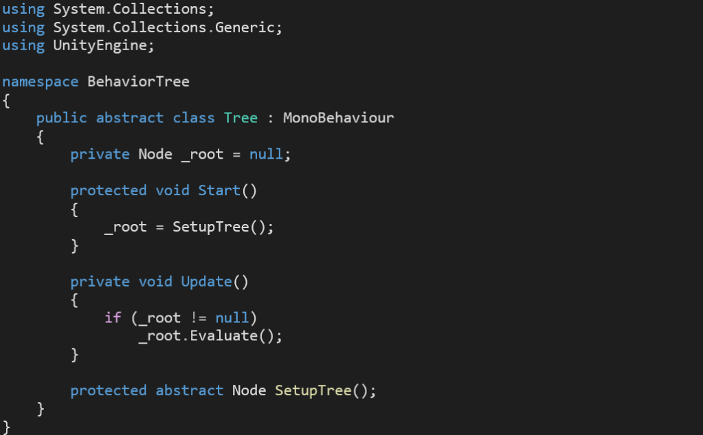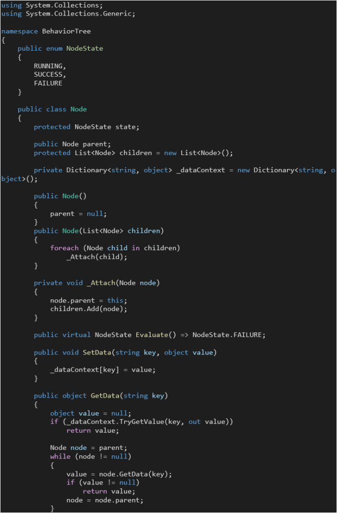 Behaviour trees are abstractions that can aid developers in creating complex frameworks for entities within games to use to simulating real behaviour patterns. These abstractions consist of defined sets of modes that are mapped to specific behaviours or operations within the AI system to achieve this. This allows for the modelling of actions such as “open door”, “get weapon” and “reload gun”.