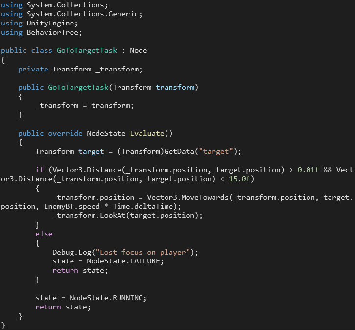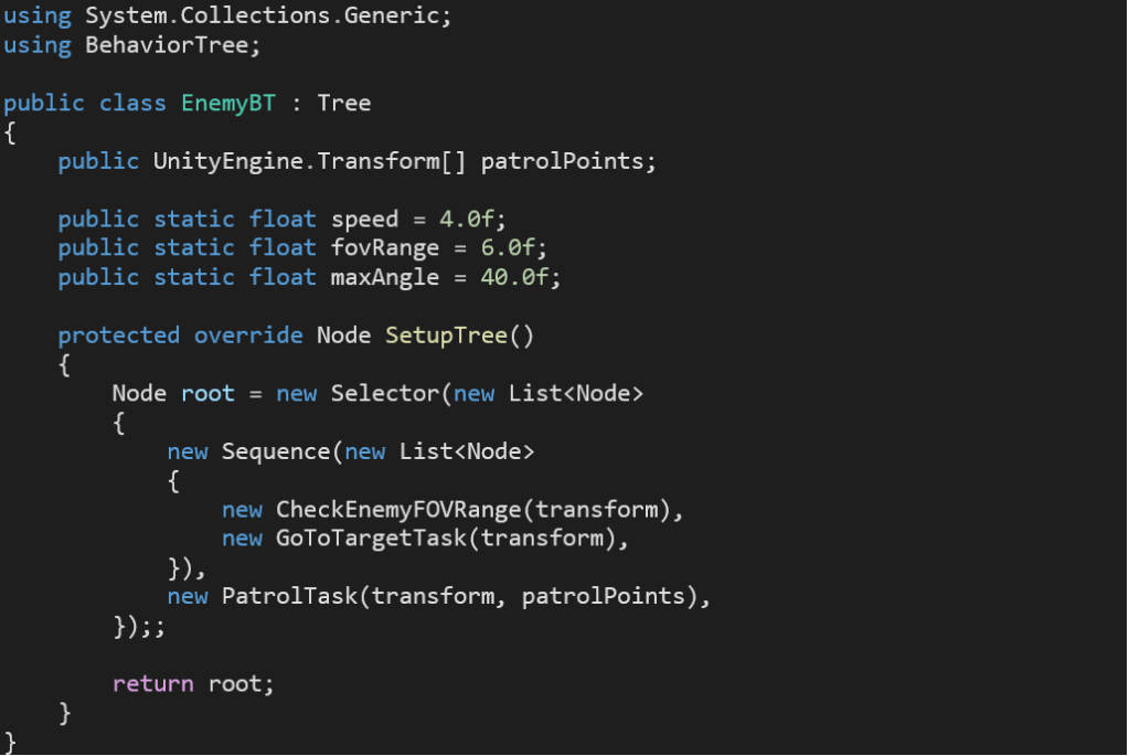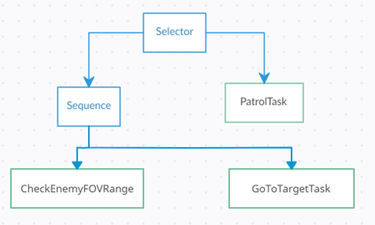 The example behaviour tree shown above is that of the system developed for task 2 of this assignment. This tree begins first t a selector. This selector is specifically selecting from a sequence, and the PatrolTask node. The first of these two options is the sequence. This is connected to two tasks, these being CheckEnemyFOVRange and GoToTargetTask. When the sequence is ticked it runs the code for CheckEnemyFOVRange, specifically filling the “target” data structure if it can be, then the GoToTargetTask code is run in accordance with the sequence parent node above it, and the agent moves to a given location. Finally, the PatrolTask node is invoked while there is no player in sight of the agent, making the agent patrol between the 5 set patrol points.