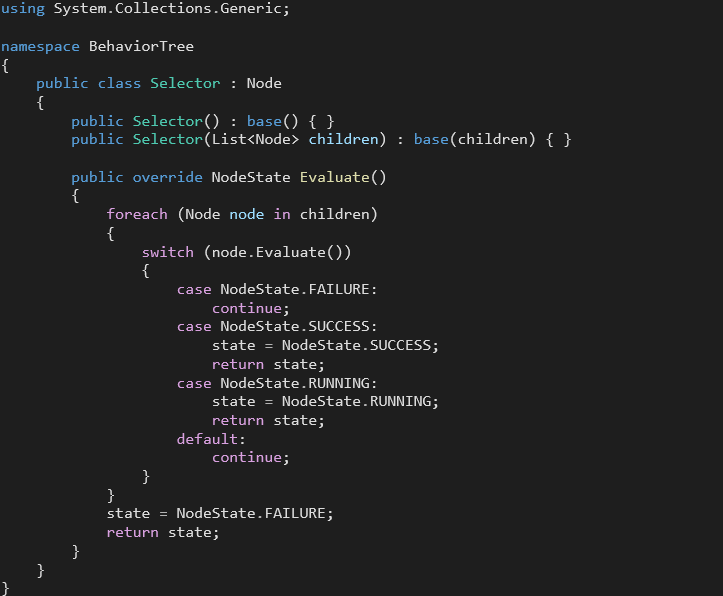 As stated previously in this report, the implementation of BT’s involves the system traversing the tree starting from the root node usually each frame, testing nodes to see which is active, finally ticking said active node. The implementation of HTN’s is like that of BT’s. Tasks are performed according to the networks hierarchal structure, complying with required parameters when met, and executing required actions accordingly. Finally, GOAP networks utilise a planner manager which scans the data structure. It then creates a list of actions required to meet a desired goal, fulfilling a first in first out design structure, finally executing these actions in order.