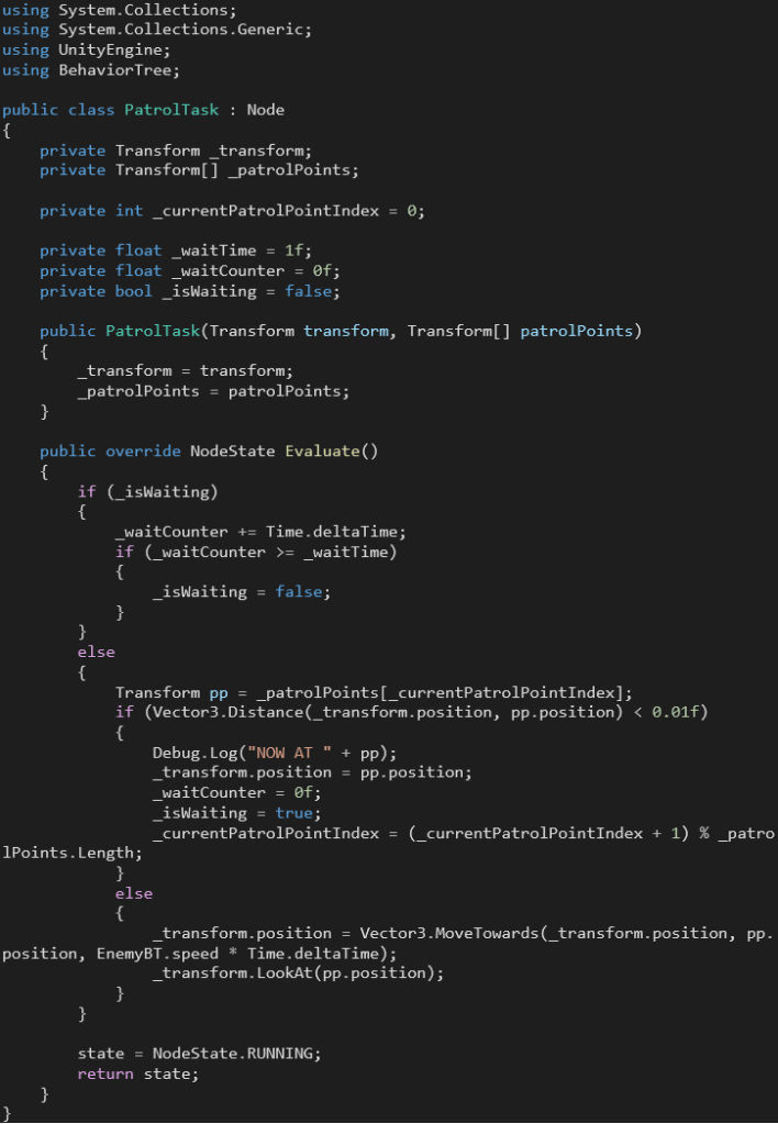 | Returning to patrol | The Enemy AI agent returns to its patrol route when the player gets too far away from it | The Enemy AI agent returns to its patrol route when the player gets too far away from it |